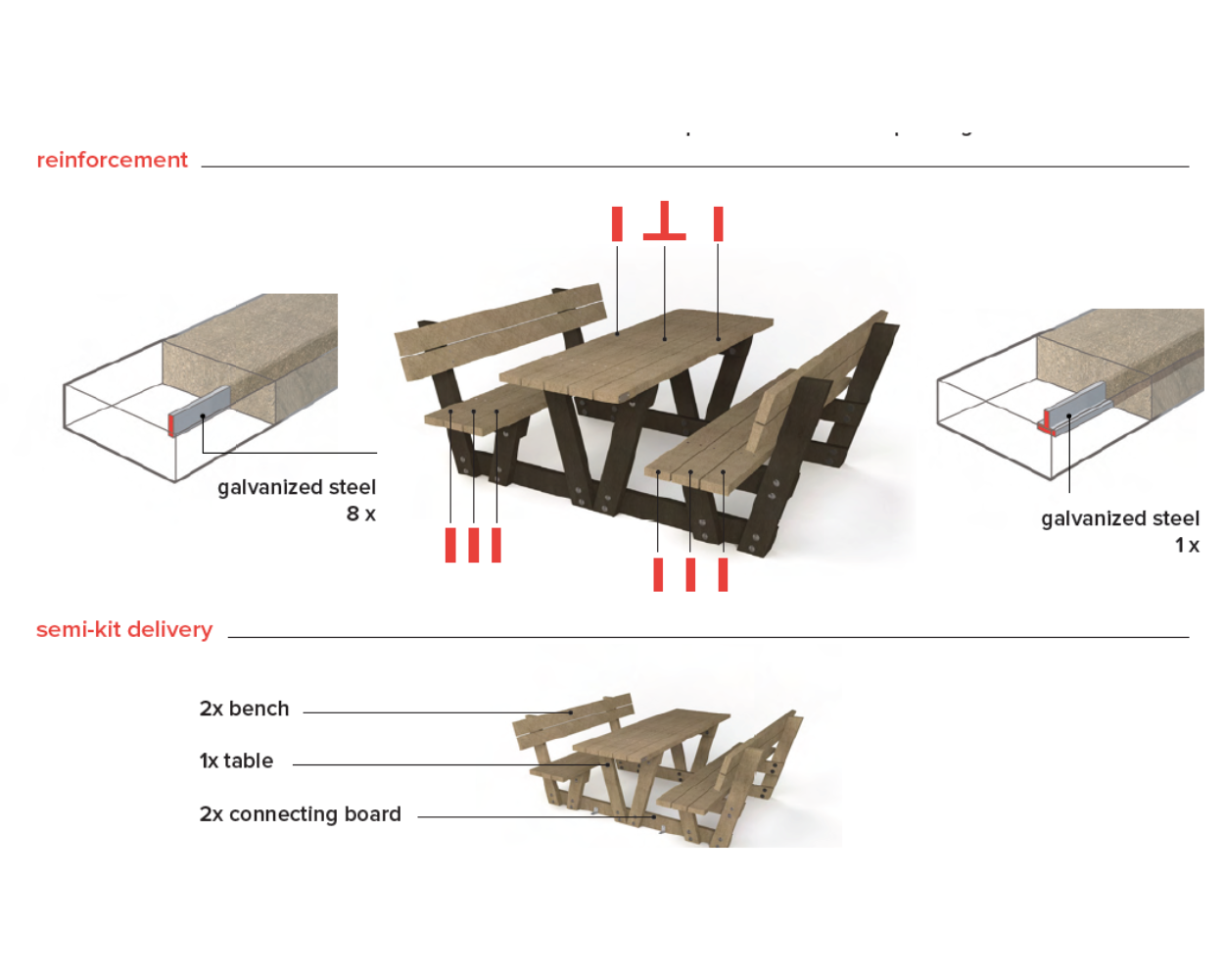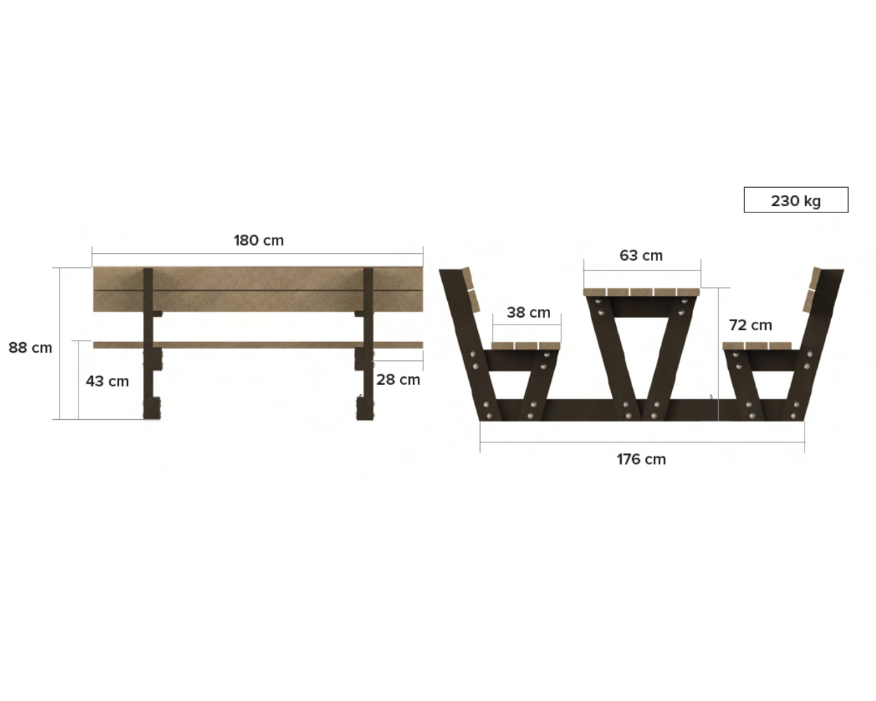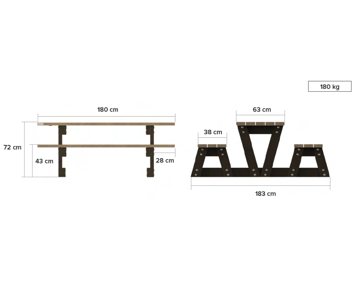 Bordet og bænkesæderne er fremstillet af massivt genbrugsplast, som er modstandsdygtigt over for fugt, råd, skadedyr og UV-stråling. Det betyder, at Lyon picnicbordet hverken kræver maling, oliebehandling eller anden løbende vedligeholdelse. De kraftige stel i varmgalvaniseret stål sikrer ekstra stabilitet og gør bordet velegnet til intensiv brug i det offentlige rum.