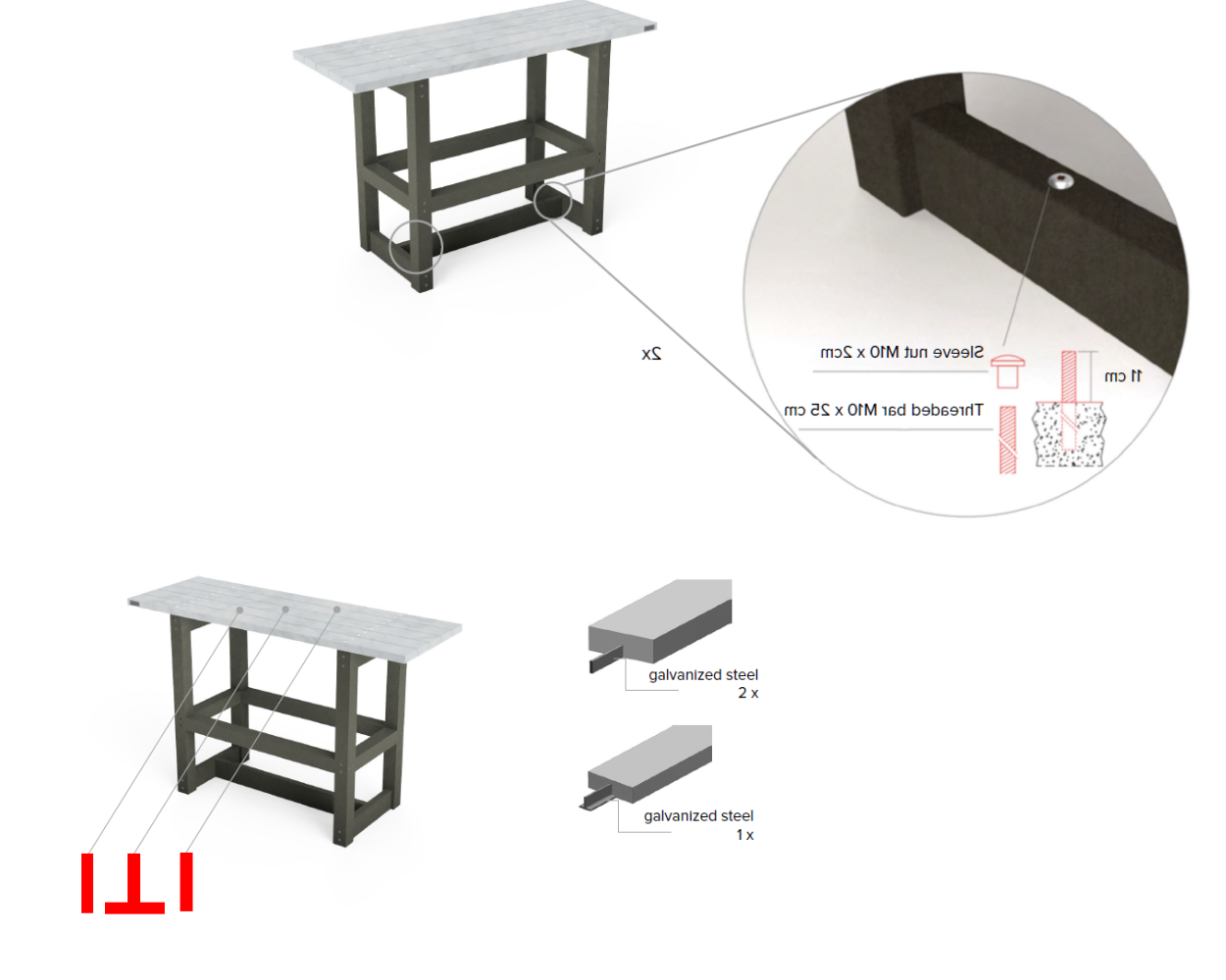 Både bordpladen og sæderne er lavet af 100% genanvendt plast (PE og PP) med en naturlig tekstur og gennemfarvede overflader, som modstår slid, graffiti, råd og UV-stråler. Stellet i varmgalvaniseret stål sikrer høj stabilitet og lang levetid, selv under krævende vejrforhold.