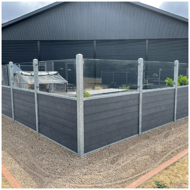 Glashegn Struktur - et vedligeholdelsesfrit hegn med plastplanker for neden og glas for oven.