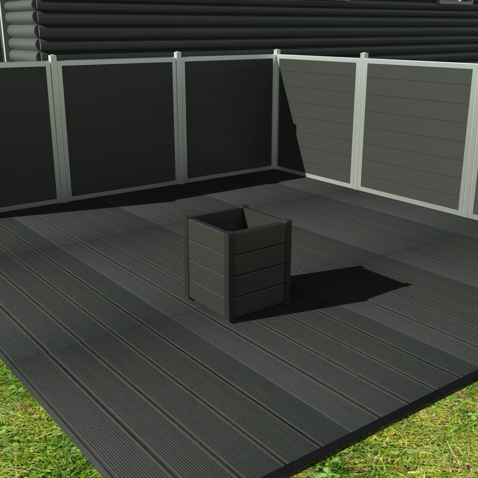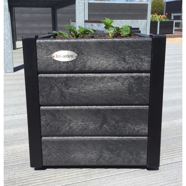 Blomsterkummen består af sorte stålstolper som hjørner og plastplanker.