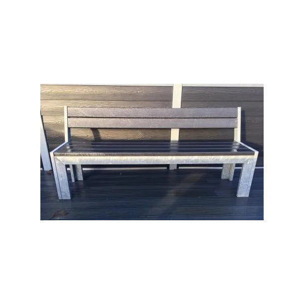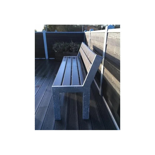 Flot og stilren bænk med ryglæn i varmgalvaniseret stål og plastplanker.