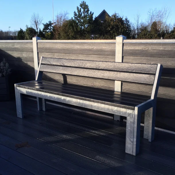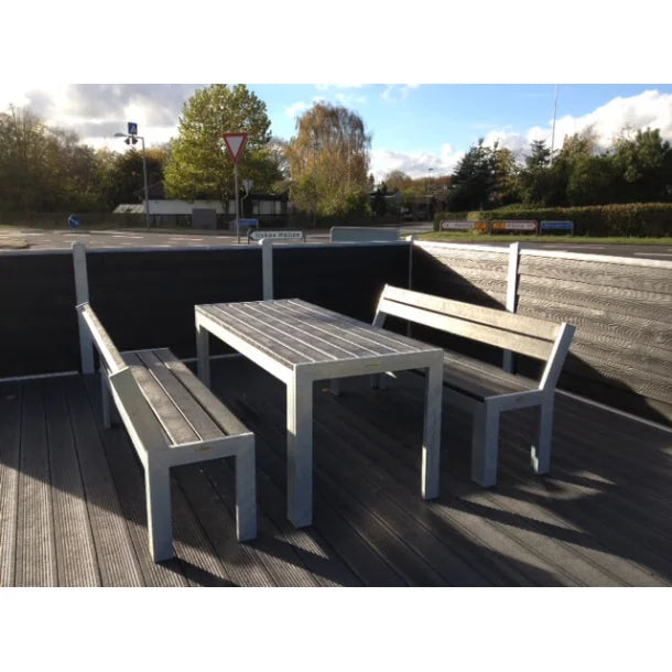 Denne materialekombination gør bænken total vedligeholdelsesfrit. Plastplankerne er massive og består af 100% genbrugsplast. Stellet er fuldsvejst. Profil størrelsen på stellet er 80x30 mm og godstykkelsen er 2 mm.