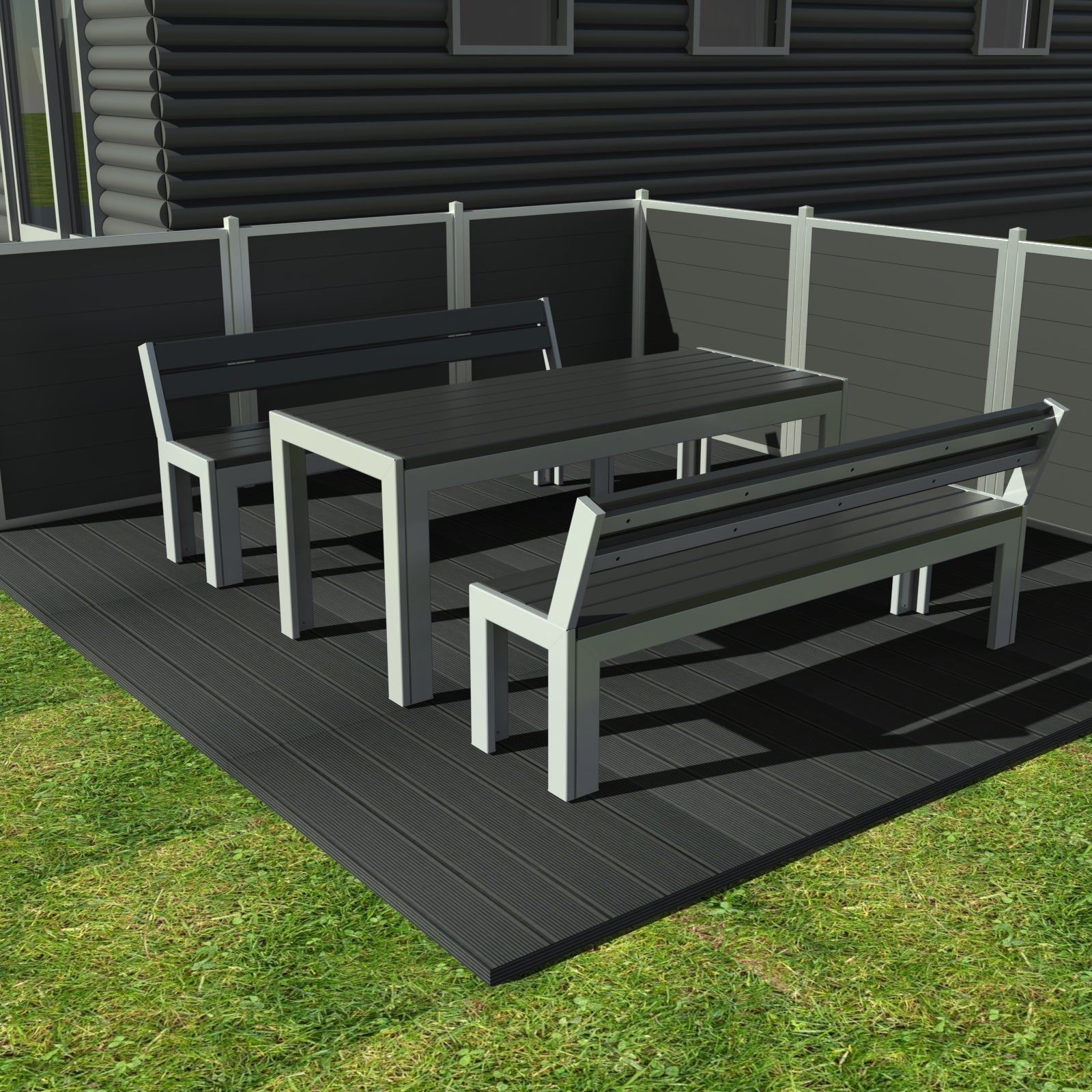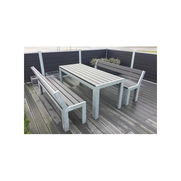 Flot og stilrent bord bænkesæt i varmgalvaniseret stål og plastplanker.