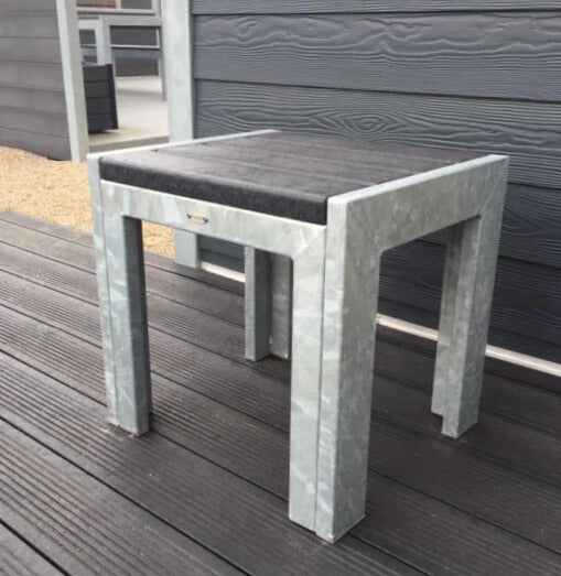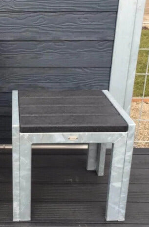Flot og stilren stol uden ryglæn i varmgalvaniseret stål og plastplanker.