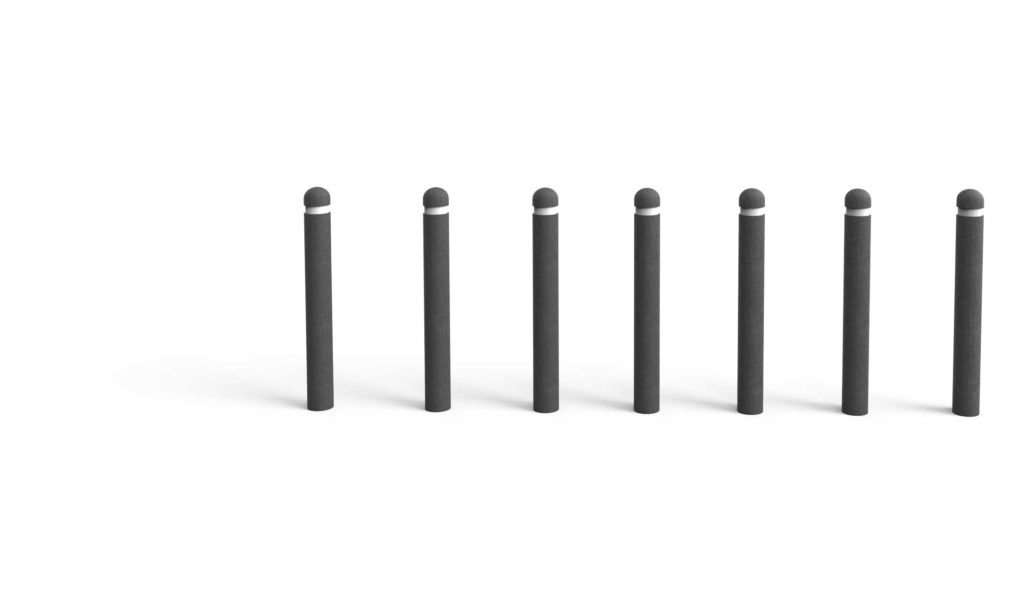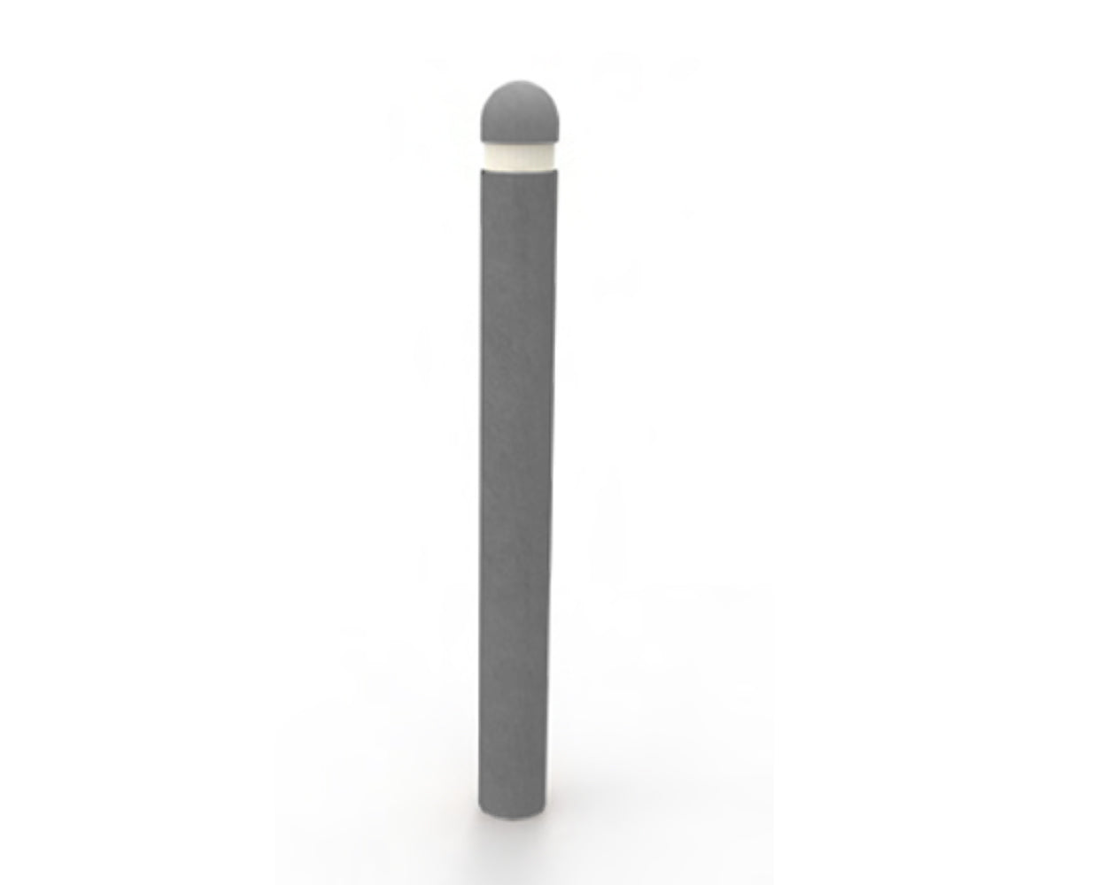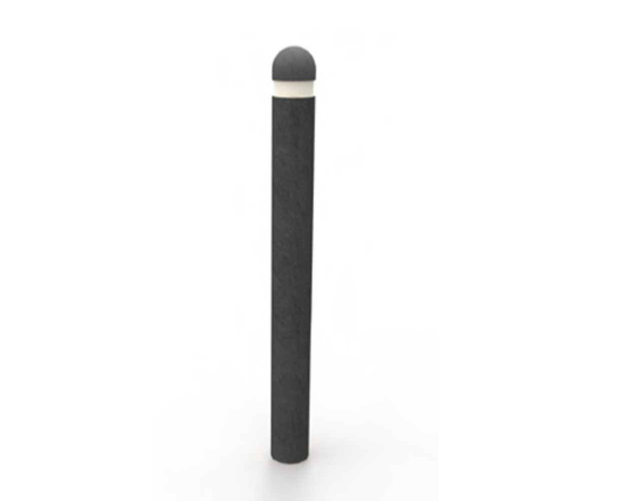 Den runde form afsluttes med en kuppelformet top og er udstyret med en bred refleksstribe, som sikrer høj synlighed – selv i mørke eller dårlige vejrforhold. Dette gør pullerten til en sikker løsning, der advarer og leder trafikken effektivt uden at forstyrre det visuelle udtryk i omgivelserne.