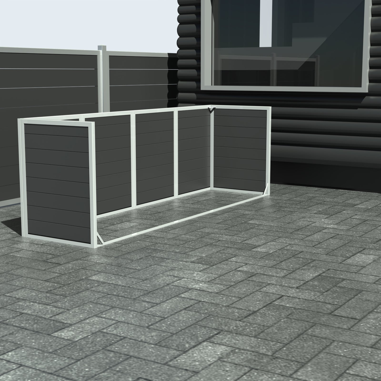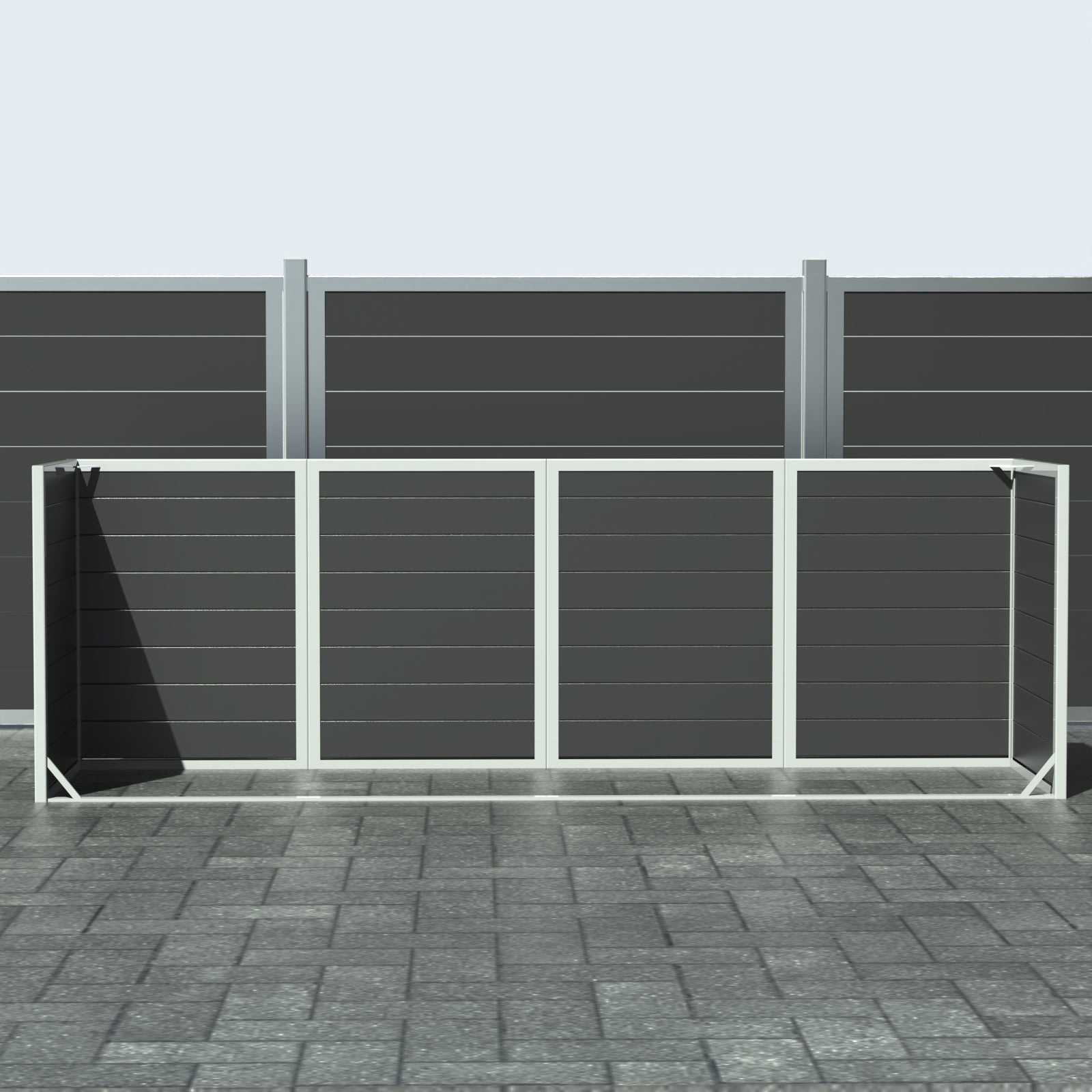 Skraldespandsskjuleren består af en galvaniseret stålramme beklædt med glatte plastplanker.