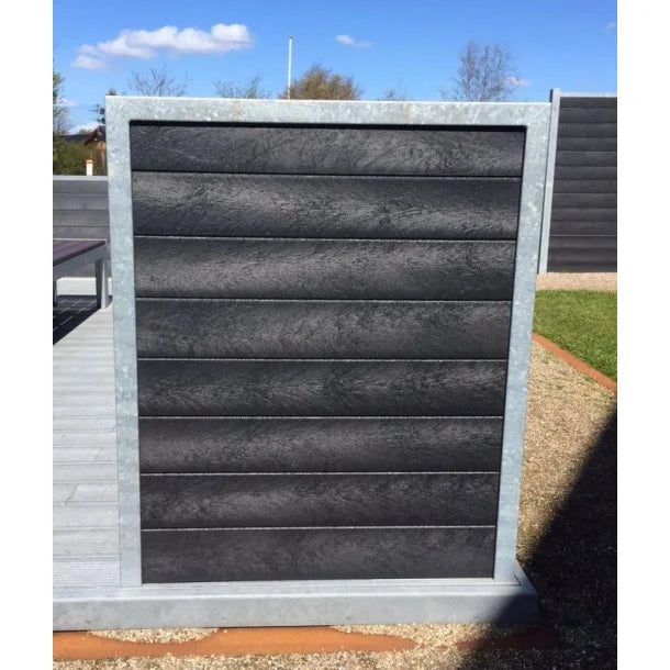 Vi producerer vores skraldespandsskjulere i varmgalvaniseret stål og beklæder dem med vedligeholdelsesfrie genbrugsplastplanker.
