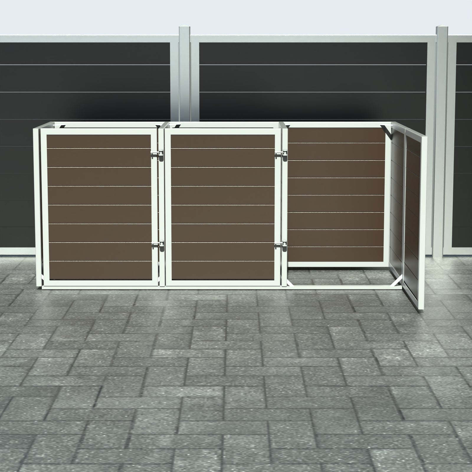 Skraldespandsskjuleren består af en galvaniseret stålramme beklædt med glatte plastplanker.