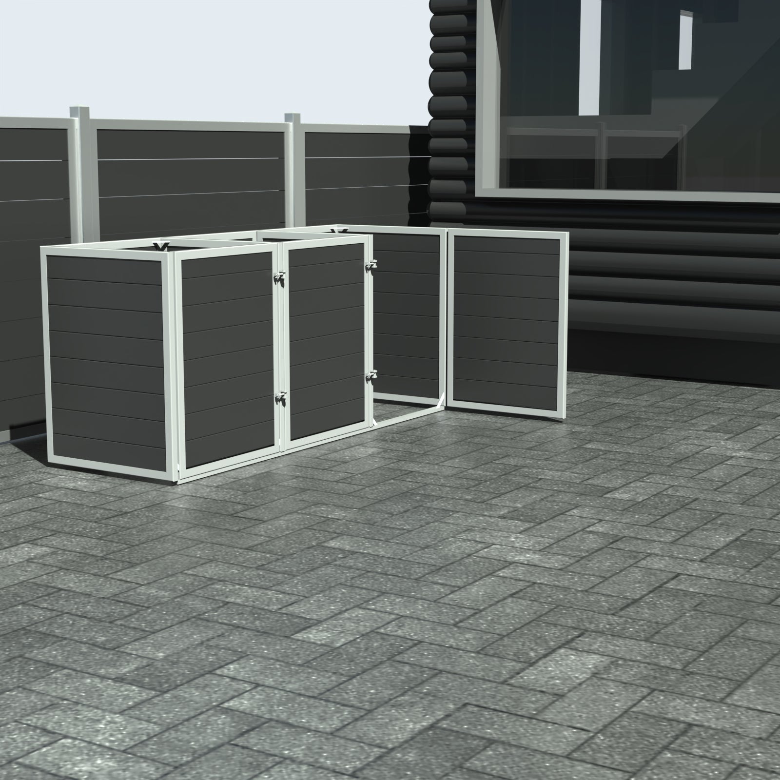 Skraldespandsskjuleren består af en galvaniseret stålramme beklædt med glatte plastplanker.
