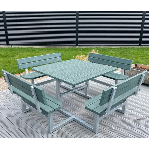 Rummeligt og solidt kvadratisk bordbænkesæt med ryglæn i høj kvalitet. Bordbænksættet er beregnet med plads til 8 personer.