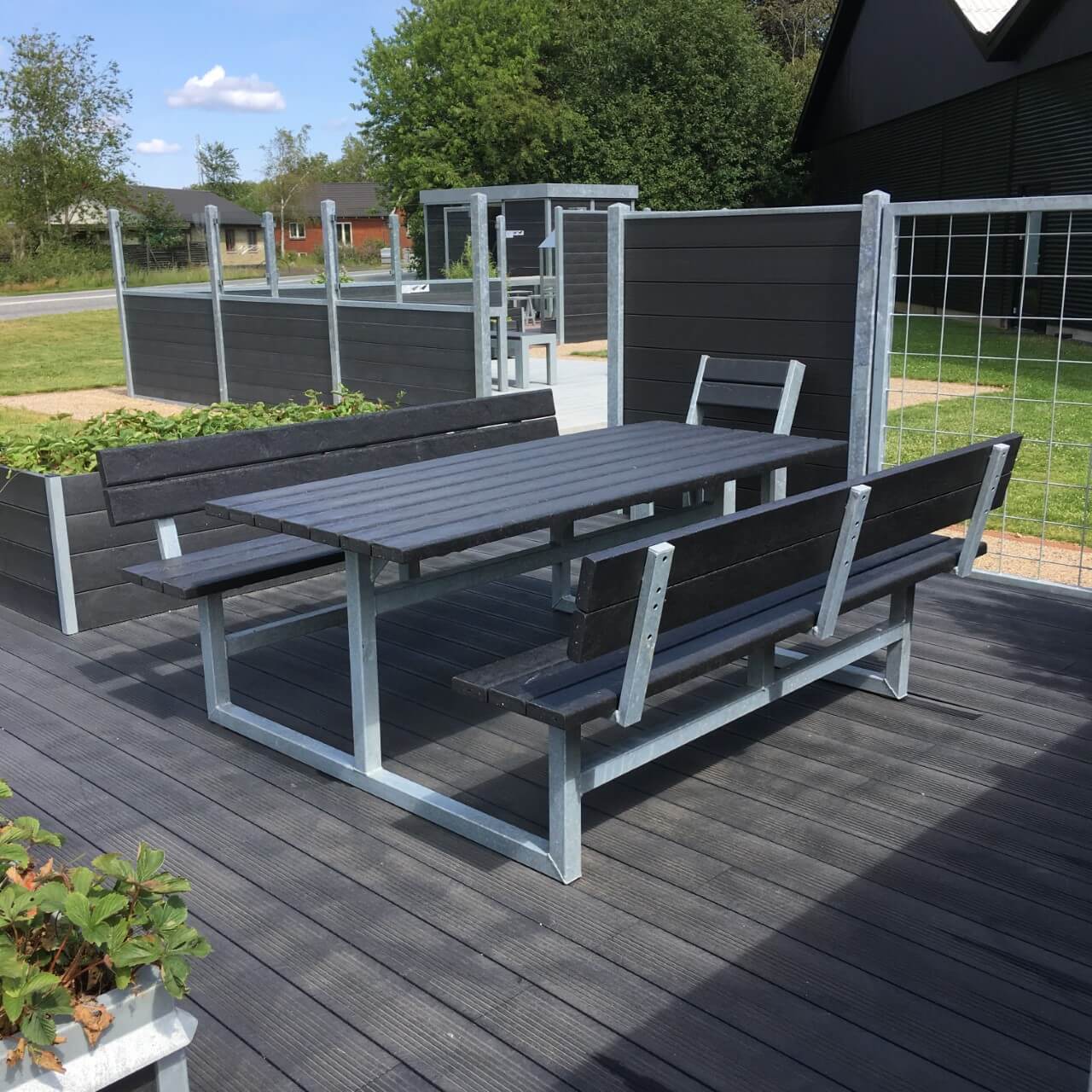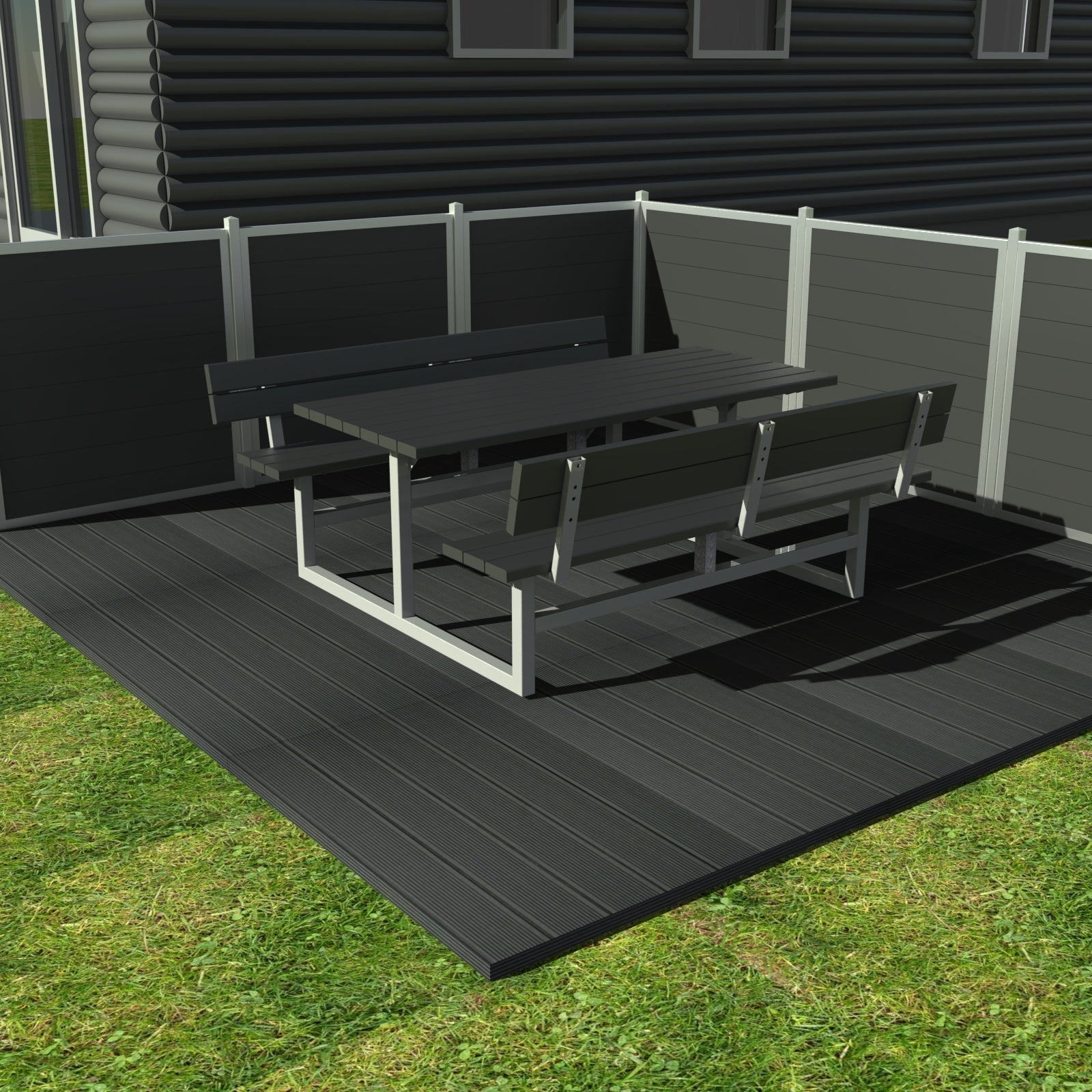 Bordbænksættet er udstyret med plastplanker i 100% vedligeholdelsesfri genbrugsplast, som er et holdbart alternativ til komposit. Plastplankerne fås i farverne sort, grå, brun og grøn.