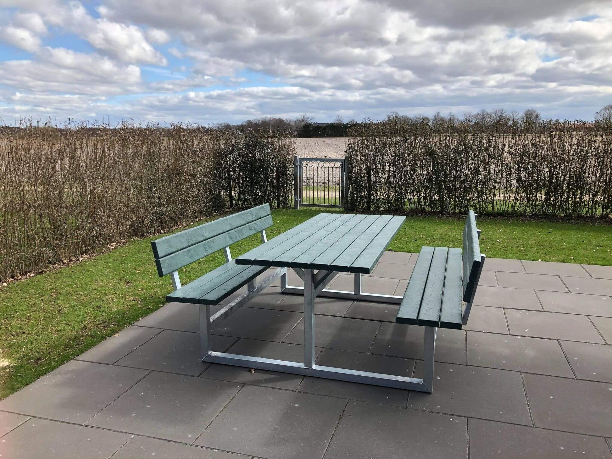 Vedligeholdelsesfrit bord bænkesæt med ryglæn samt genbrugsplastplanker