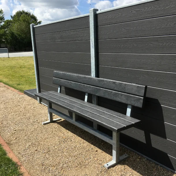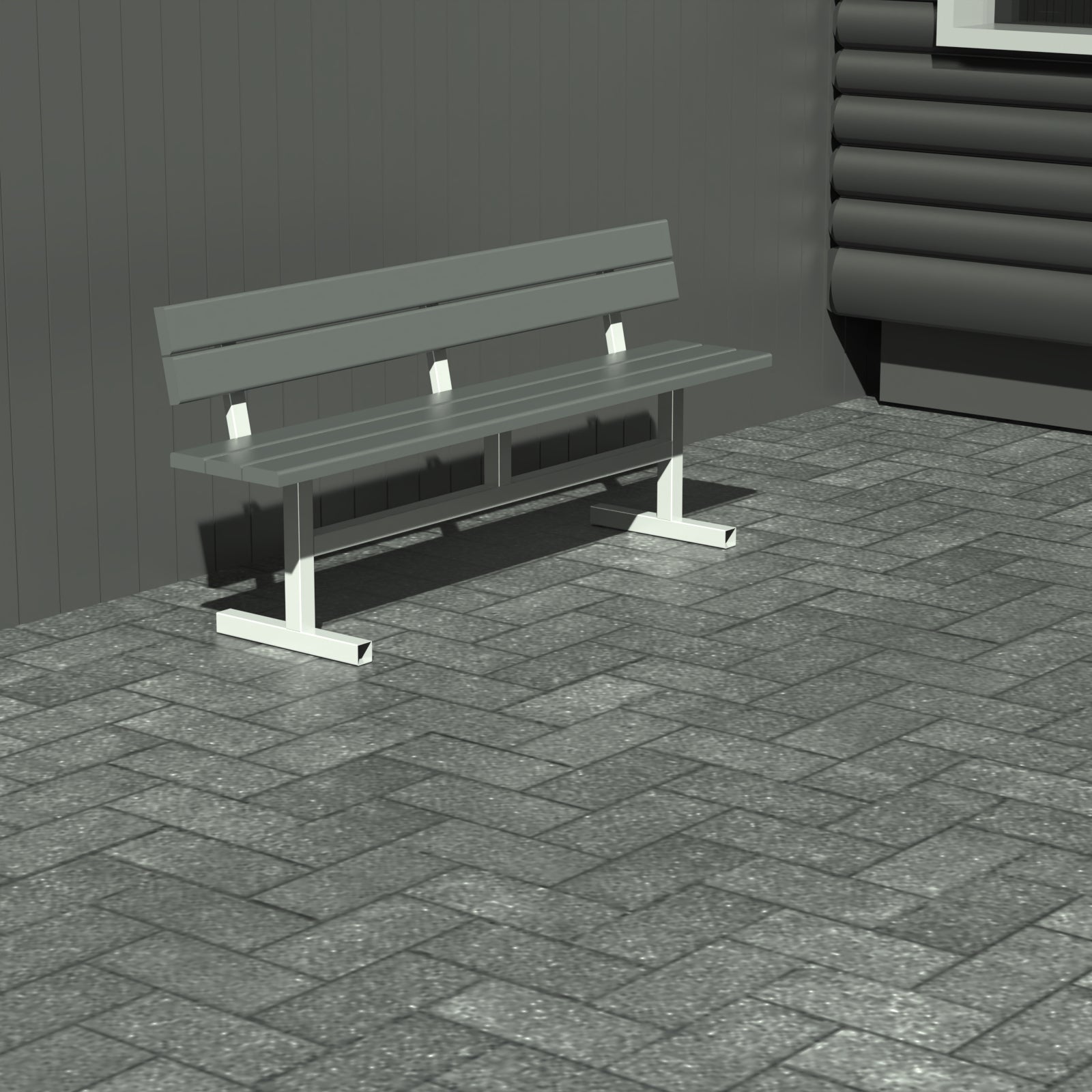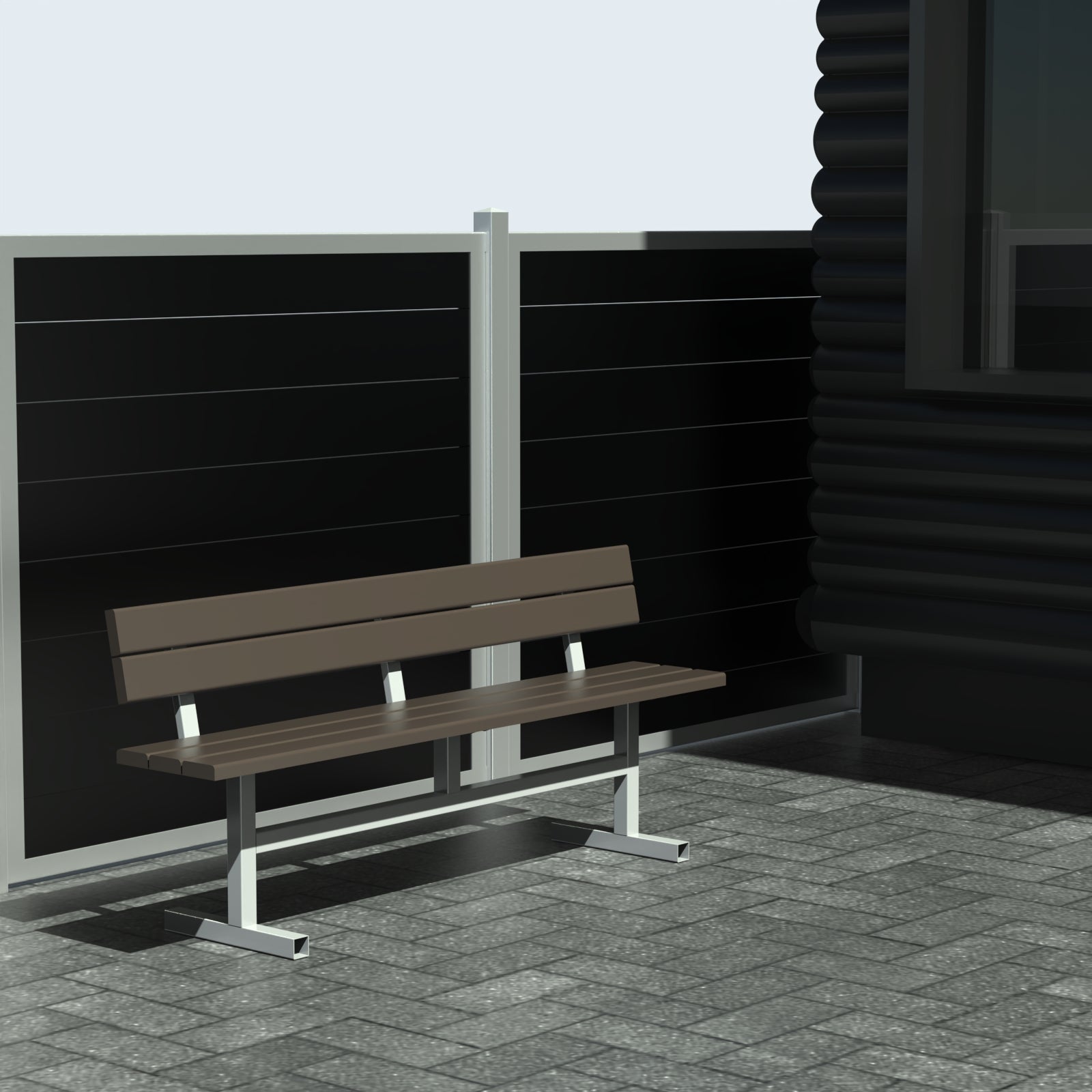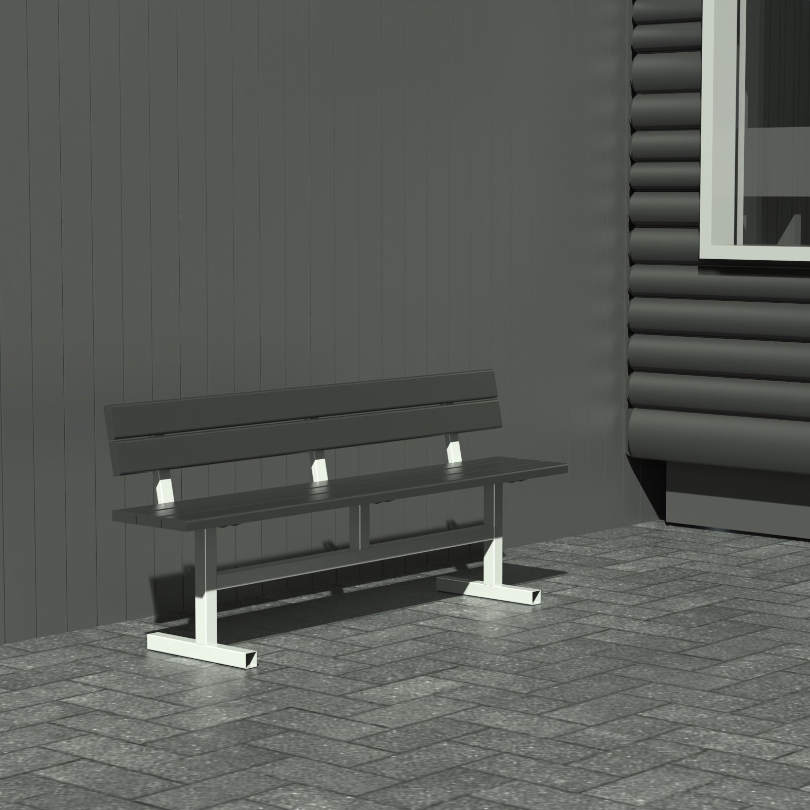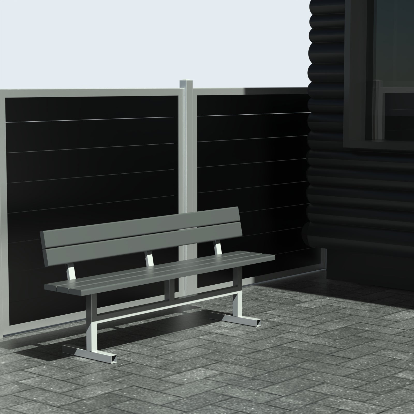 Bänken består av varmförzinkat stål och svarta plastplankor.