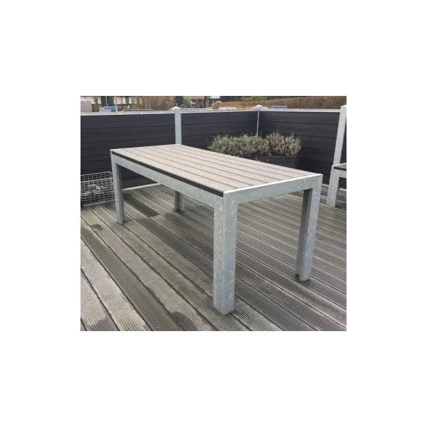 Vackert och elegant bord i varmgalvaniserat stål och plastplankor.