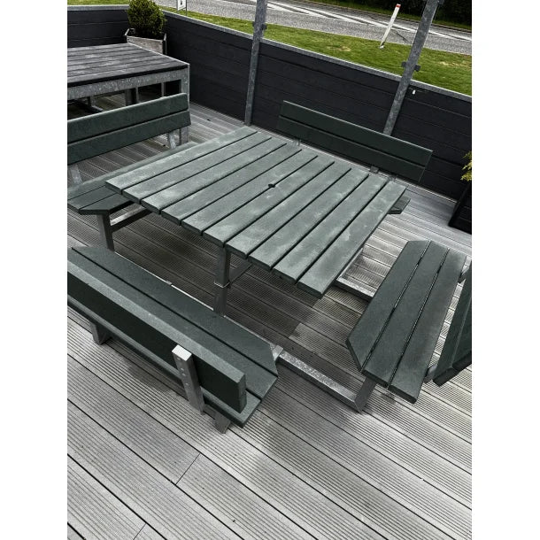 Rymlig och solid fyrkantig bords- och bänkgrupp med högkvalitativt ryggstöd. Bord- och bänkgruppen är utformad för att ge plats åt 8 personer.